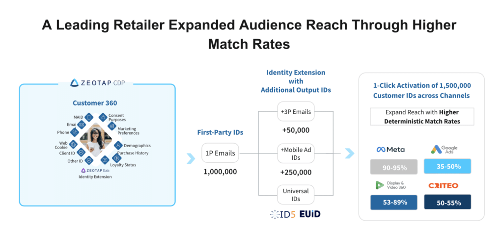 Finally, reaching a broader, relevant audience was a key objective. Leveraging Zeotap’s native ID Extension feature, this retailer increased match rates by integrating first-party data with additional identifiers. This enhancement improved their ability to deterministically match users, which was especially effective on platforms like Criteo and Meta, leading to extended audience reach.
